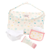 Diaper changing is a breeze with this delightful diaper bag set. Soft doll diaper changing set includes a convertible diaper bag that folds open to a soft changing mat, a diaper, 3 wipes in holder, and a diaper cream tube.